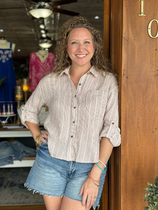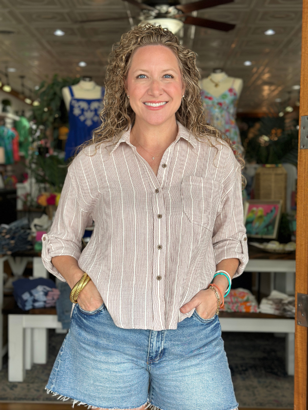 This Amber Striped Gauze Top features a lightweight, breathable fabric with a subtle striped pattern, perfect for layering or wearing on its own. The button-up design offers versatile styling options, while the soft gauze material ensures comfort throughout the day. Ideal for casual or refined looks, this top combines effortless style with expert craftsmanship.