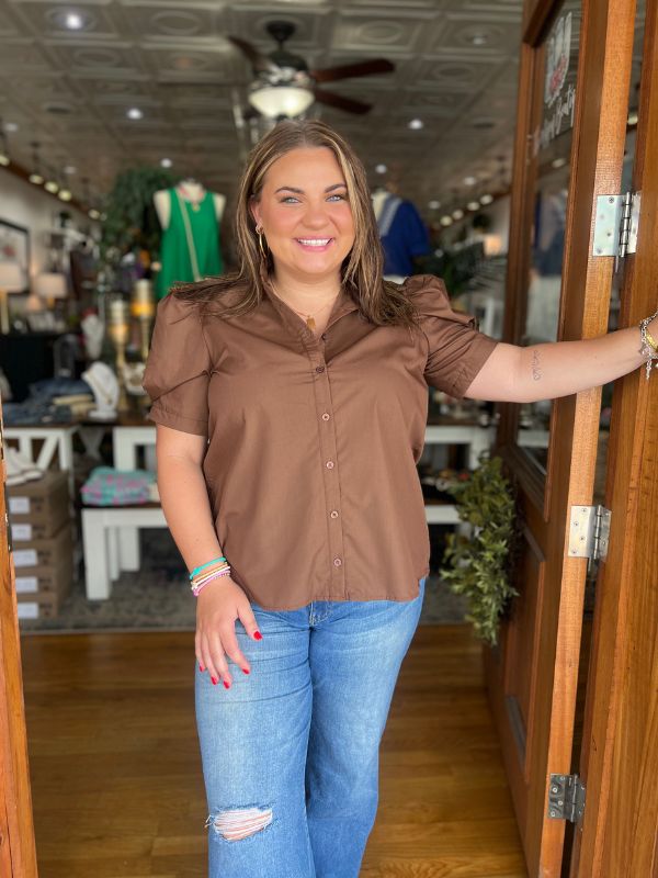 This brown short-sleeve top features structured puff shoulders and a button-front closure for a polished look. The ruffle-finished band collar adds a delicate, feminine touch. Crafted from lightweight woven fabric, it offers comfort without sheerness, making it ideal for layering or wearing alone. Unlined for breathability, this piece combines style and practicality effortlessly.