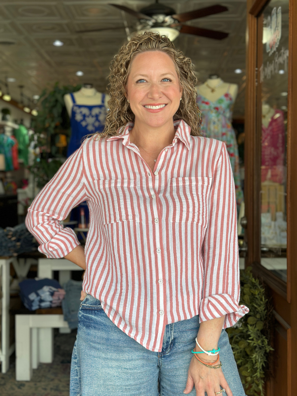 This Coral Striped Gauze Button Up Top offers a timeless silhouette crafted from breathable cotton gauze for lightweight comfort. Featuring a classic cut with subtle stripes, it includes practical chest pockets and a rounded hemline that enhances its relaxed yet polished look. Ideal for layering or wearing on its own, this top combines effortless style with everyday functionality.