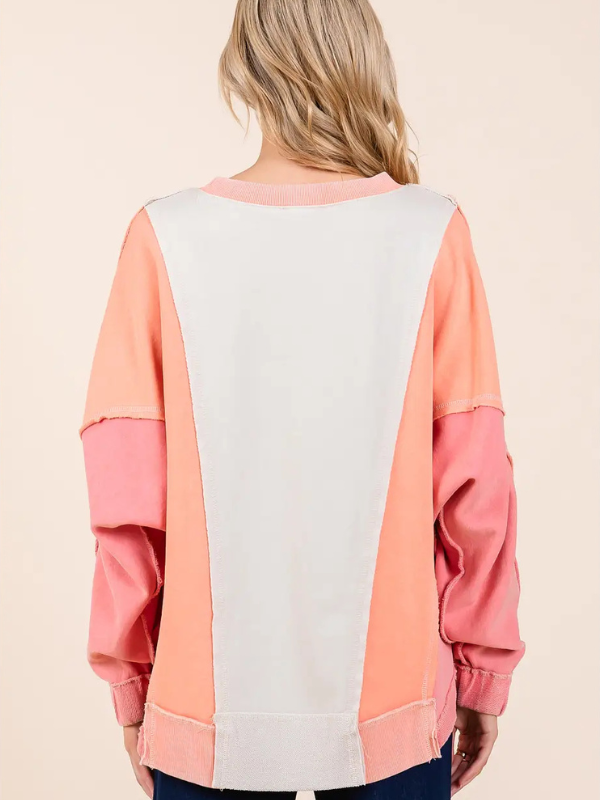Crafted from soft cotton French terry with a distinctive mineral wash, the Coral Combo Top features a modern color block design and exposed seaming details for subtle texture. Its relaxed silhouette is enhanced by a round neck and dolman long sleeves with elastic cuffs, offering comfortable ease and refined structure in a loose-fit pullover style. Ideal for layering or wearing alone, this top blends casual comfort with tailored design elements.