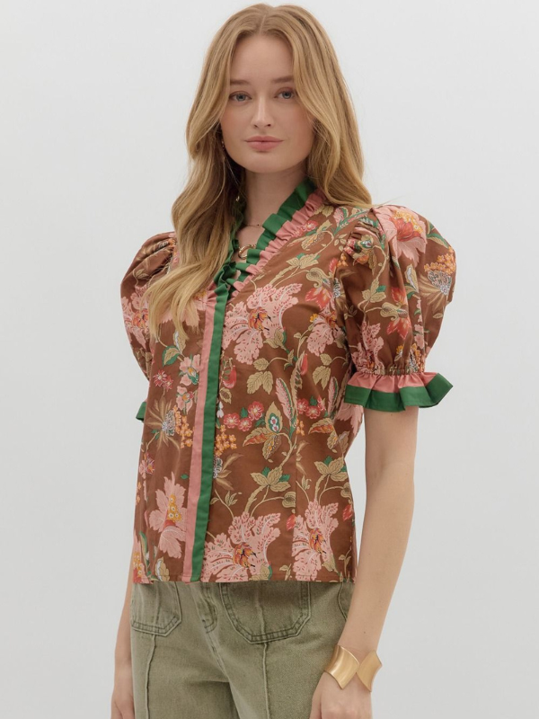 This Fall Floral Puff Sleeve Top showcases a delicate floral print with multicolor accent ruffle bands along the shoulders, adding a refined touch to its design. Crafted from lightweight woven fabric, it offers a comfortable, non-sheer fit without lining, making it ideal for layering or wearing on its own during transitional seasons. The puff sleeves provide subtle volume, enhancing the silhouette with expert tailoring.