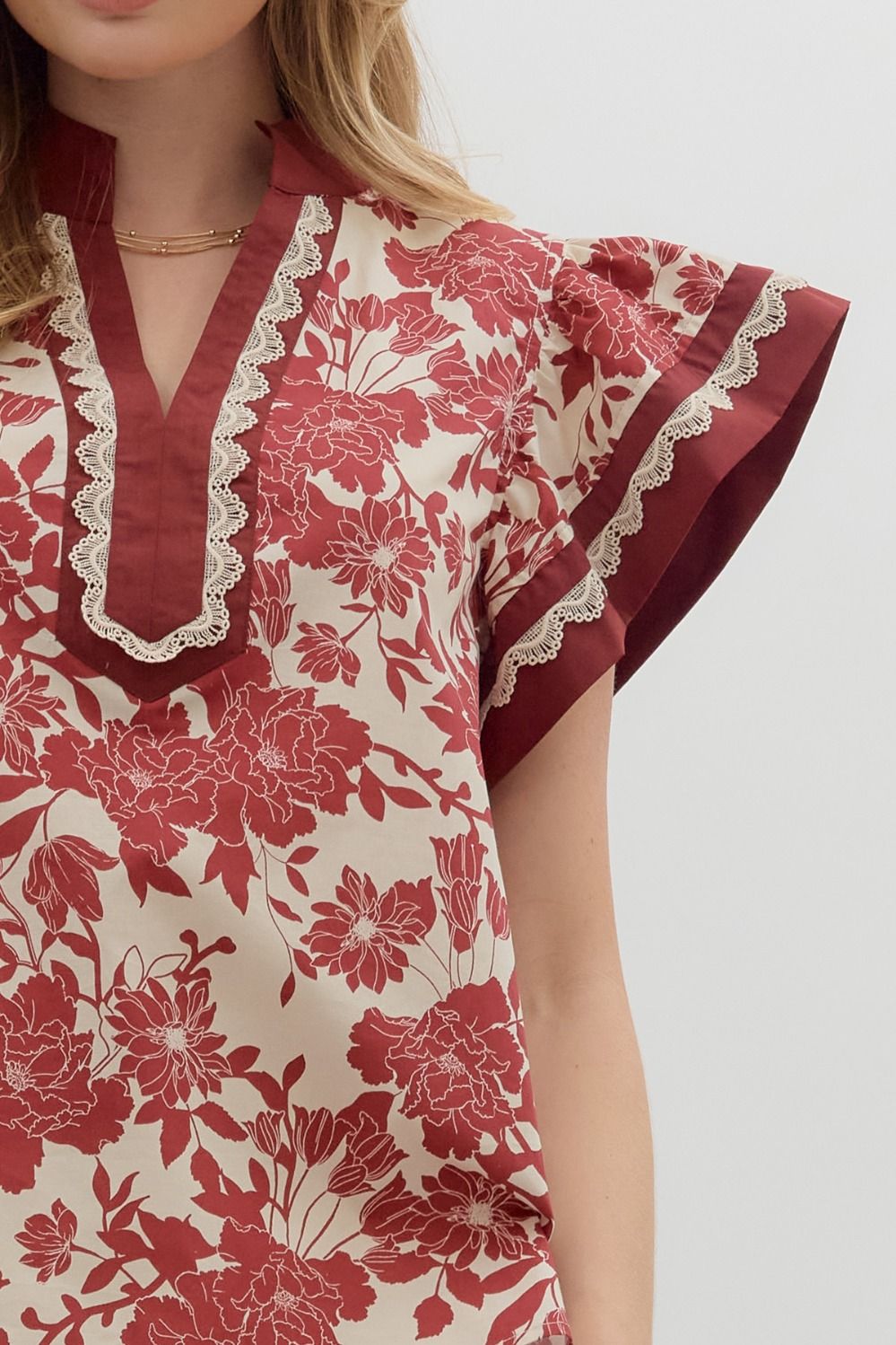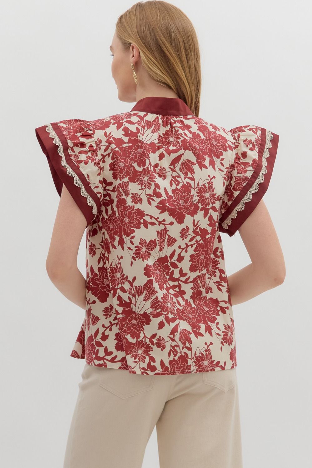 This Floral Flutter Sleeve Top combines delicate design with expert craftsmanship. Featuring a lightweight woven fabric, it offers comfort without sheerness. The flutter sleeves add a graceful movement, while the contrast accent band with scallop lace trim inset provides refined detailing. Unlined for breathability, this top is an elegant choice for a polished, feminine look.
