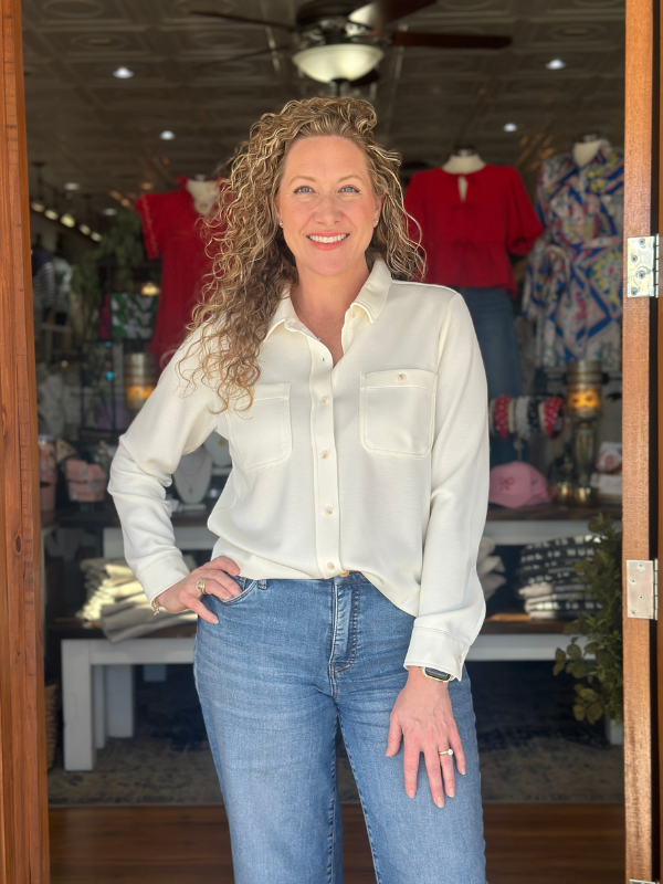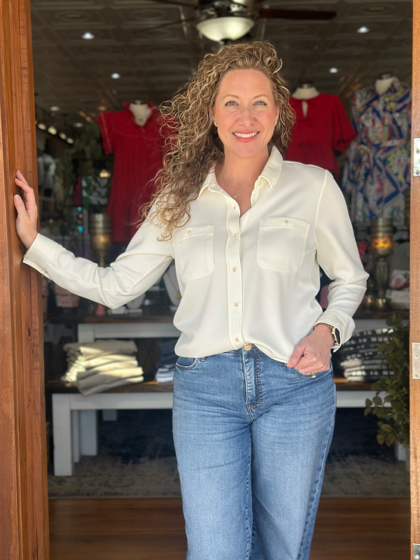 Not your average button up, this one feels like a soft sweatshirt! Featured in our super comfy scuba fabric with a button front closure and dual patch pockets. Wear with our Mildred Pant to complete the matching set.