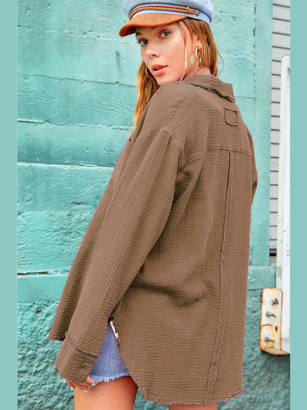 Add a playful twist to your wardrobe with the Mocha Gauze Button Down Shirt. Crafted from soft, washed crinkled gauze fabric, it features a relaxed, oversized fit that’s perfect for layering. The collared neckline and button-down front add classic charm, while the raw hem and chest pockets bring an effortless, easygoing vibe. Whether worn open or buttoned up, this long-sleeve shirt will be your go-to piece through every season.