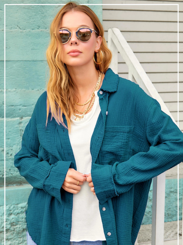 Add a playful twist to your wardrobe with this Teal Gauze Button Down Shirt. Crafted from soft washed, crinkled gauze fabric, it features a relaxed, oversized fit with a collared neckline and button-down front. Two handy chest pockets and a raw hemline add charming details, making it perfect for layering or wearing on its own year-round. Effortless style has never felt so comfy!