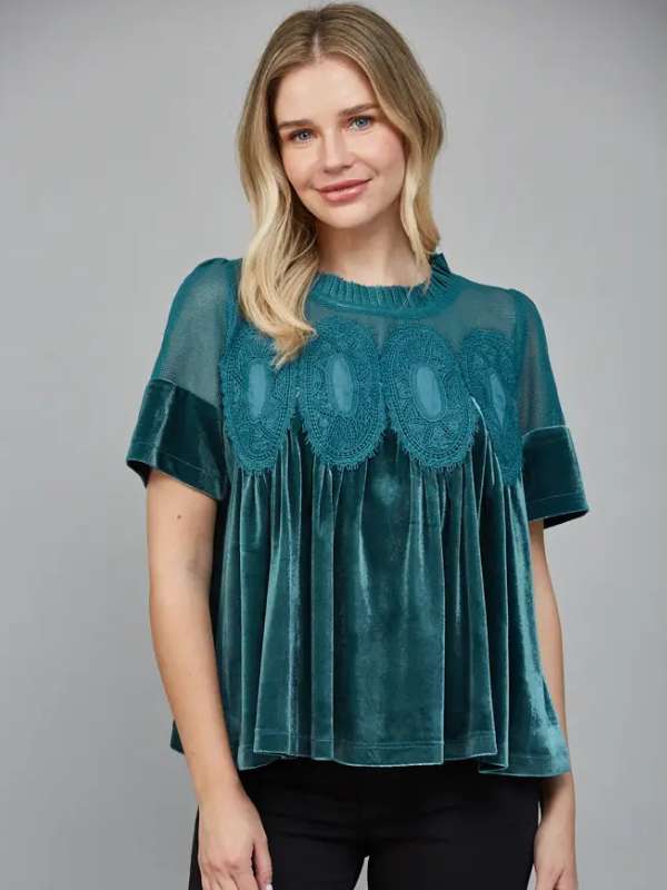 Elevate your wardrobe with this Teal Green Velvet Babydoll Top, featuring delicate lace detailing for a refined touch. Crafted from plush velvet, it offers both a luxurious feel and flattering silhouette. The babydoll design provides a comfortable, airy fit that enhances movement and style, perfect for both casual outings and elegant occasions.